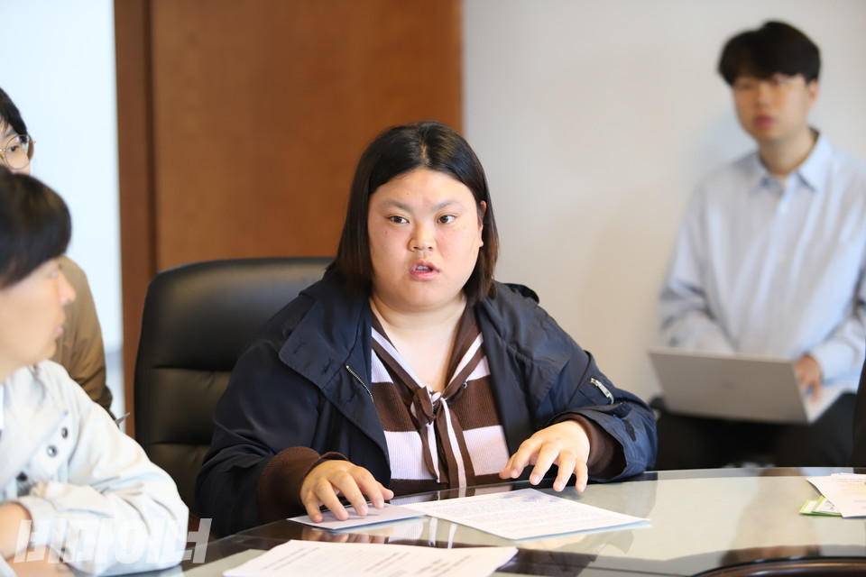 2025년 5월 7일, 정순택 대주교와의 면담 자리에서 박경인 전국탈시설장애인연대 공동대표가 발언하고 있다. 사진 김소영
