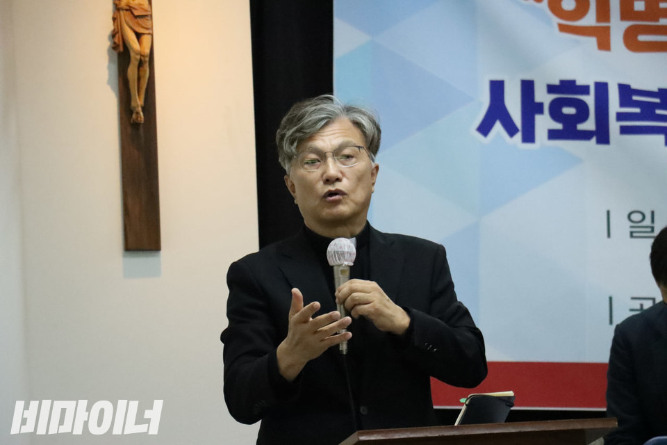2024년 11월 8일, 이기수 신부가 ‘국가의 전체주의적 탈시설 정책으로 죽어가는 익명의 장애인들에 대한 입장문’을 발표하는 기자회견에서 발언하고 있다. 사진 김소영