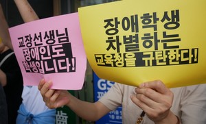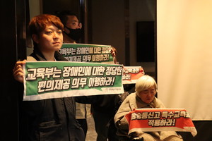 전국장애인야학협의회(아래 전장야협)가 7일 오후 2시 방송통신고등학교 특수교육과정 적용을 촉구하기 위해 방송통신고등학교 시도교육청 협의체 회의에서 긴급행동을 벌였다. 15여 명의 장애인과 비장애인 활동가들은 회의장에서 피케팅을 하며 발언권을 얻어, 방송통신고등학교 특수교육과정 적용의 필요성을 강력히 호소했다.- 중학교 졸업해도 고등학교에 진학할 수 없는 성인장애인들대구에 거주하는 뇌병변과 지적장애를 가진 이상근(54) 씨, 지적장애를 가진 김태완(57) 씨와 이정모(47) 씨는 긴급행동에 참여하기 위해 이른 오전부터 서울로 향했다.