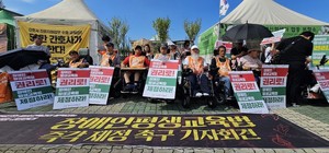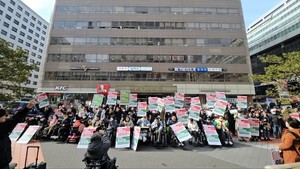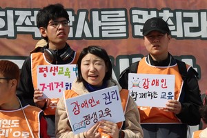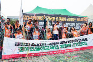 전국장애인야학협의회(아래 전장야협)가 지난 14일 오후 2시, 9일 간의 농성을 마무리하고 국회 앞에서 ‘장애인평생교육법 제정 촉구 권리 팔만대장경 농성 투쟁 보고대회’를 열었다.전장야협은 지난 4일 장애인야학에 다니는 학생과 교사 23명의 삭발투쟁을 시작으로 국회의사당역 지하에서 농성을 벌였다. 이들은 농성을 진행하며 국회에 장애인평생교육법 제정을 촉구하는 엽서를 작성했다.장애인들과 연대 시민들의 적극적인 참여로 모인 엽서는 총 4천98장으로, 목표했던 글자 수 8만 자에 달했다. 또한, 활동가들은 매일 국민의힘·더불어민주당·조국