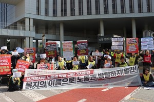 “복지란 이름으로 중증장애인 노동권 박탈하지 마라!”장애인 공공일자리를 확대하겠다고 밝힌 이재명 정부의 보건복지부(아래 복지부)가 전국권리중심중증장애인맞춤형공공일자리협회(아래 전권협) 등의 노동권 보장에 대한 요구를 수용할지 귀추가 주목된다.20일 오전 11시 세종시 복지부 앞에서 전권협과 단체 회원들이 모여 복지부의 복지일자리 사업을 규탄하는 기자회견을 열었다. 복지부의 장애인일자리지원사업은 일반형 전일제, 일반형 시간제, 복지일자리, 시각장애인 안마사 파견사업, 발달장애인 요양보호사 보조일자리 5가지 유형으로 구성되어 있다.그중