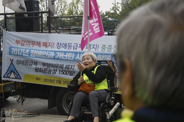 박명애 전국장애인야학협의회 회장이 “난 왜 이렇게 살아야 하나, 장애가 있다고 우릴 왜 죄인으로 만드는지 국가가 원망스럽지 않습니까. 왜 이렇게 나와서 싸우게 만듭니까.”라며 울분에 차서 발언하고 있다.
