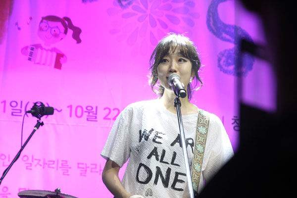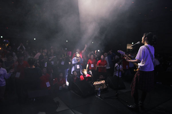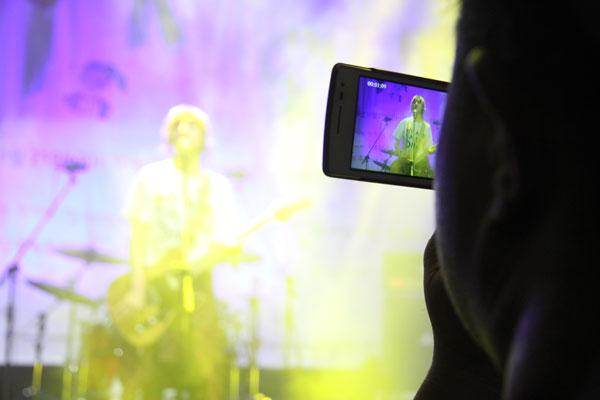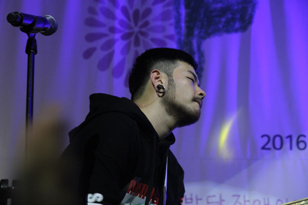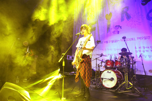 첫날 저녁, 초청 밴드 아디오스 오디오의 공연에 열광하는 사람들.
