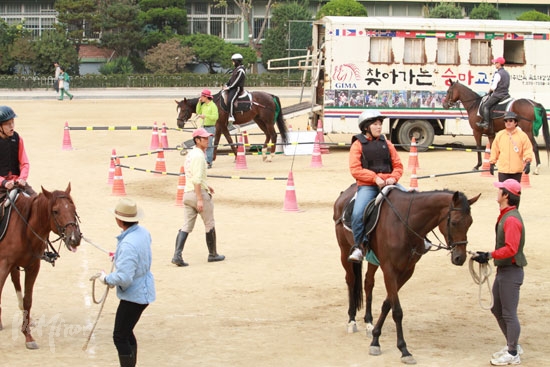 현재 강동구의 재활승마교육은 비장애학생들의 속보와 구보 등 진도 중심의 승마교육과 달리 기본 교육 이후에는 말 위에서 권총 쏘기, 고리 던지기 등 다양한 놀이 위주로 진행된다. 박 이사는 “놀이 프로그램을 개발하기 위해 외국 전문 서적을 보고 어린이집 놀이도 응용하고 있다”라면서 “또한 장애학생들이 말을 타고 밖으로 나가는 것을 좋아해 외승 비율을 높였다”라고 설명했다.