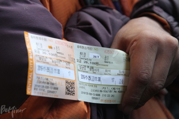 장애인 당사자가 구매한 오전 11시 광주행 프리미엄 버스 티켓을 들고 있다.