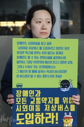 버스타기에 동행한 한 참가자가 예산을 이유로 장애인 편의시설을 갖춘 버스를 도입하지 않으면서 정작 그보다 훨씬 비싼 프리미엄 버스를 도입한 정부를 규탄하는 피켓을 들고 있다.