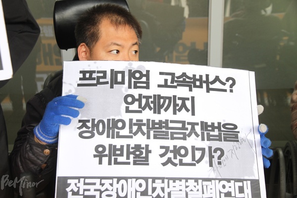 장애인 당사자가 "프리미엄 고속버스, 언제까지 장애인차별금지법 위반할 것인가?"라고 적힌 피켓을 들고 있다.