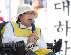 ▲국가인권위원회 현병철 위원장 사퇴를 촉구하는 야 5당과 인권사회단체의 공동결의대회에 참석한 박김영희 활동가.