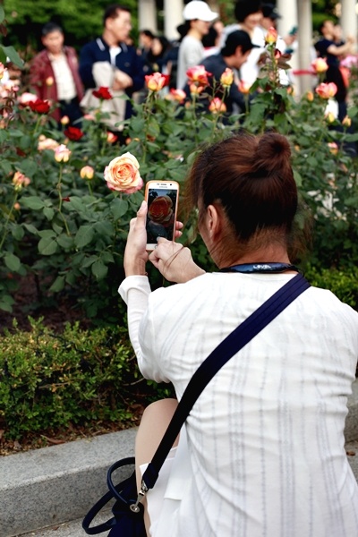 사람들이 휩쓸고 지나간 축제의 마지막 날 시달릴 대로 시달린 장미꽃이 고개를 숙이고 있습니다. 한 여성이 엉거주춤한 자세로 장미를 사진에 담습니다. 예쁜 장미를 카메라에 담겠다고 헤매다 발견한듯합니다.
