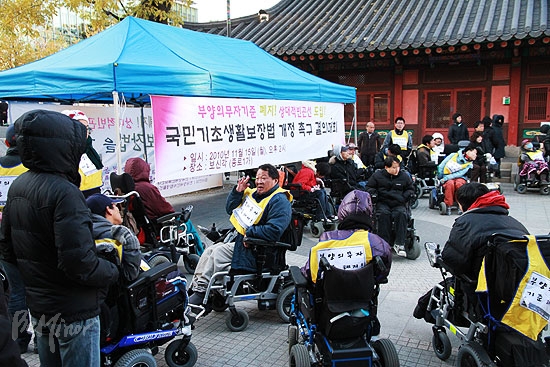 전국장애인차별철폐연대(아래 전장연), 빈곤사회연대 등 20개 단체가 참여한 국민기초생활보장법 개정을 위한 공동행동(아래 기초법개정공동행동)이 부양의무자 기준 폐지와 상대빈곤선 도입을 요구하며 15일 오후 조계사에서 천막농성에 돌입했다.
