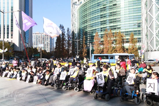 ![]() ▲ 전동휠체어를 탄 참가자들이 기초법 개정에 대한 요구가 쓰인 종이를 돌파하는 상징의식을 통해 기초법 개정에 대한 의지를 보여주고 있다. |