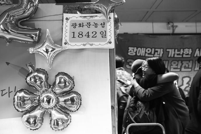 광화문 장애인 농성장입니다. 농성을 시작한 지 1,842일째 되는 날입니다. “장애 등급제 폐지하라! 빈곤의 사슬 부양의무제 폐지하라!” 하루도 빠짐없이 이 목소리가 광화문 지하도에 울려 퍼졌습니다.