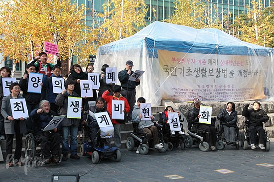 기초법개정운동은 지난 15일부터 조계사에서 부양의무자 기준 폐지와 상대빈곤선 도입을 촉구하며 천막농성을 보름째 진행하고 있으며, 24일에는 장애가 있는 아들이 지원을 받게 하기 위해 스스로 목숨을 끊은 아버지 등을 추모하는 ‘죽음으로 내몰린 장애아 부모 위령제’를 종로 보신각에서 연 바 있다.