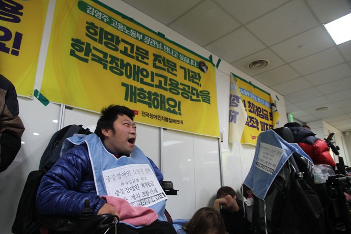 중증장애인과 장애인자녀를 둔 부모 100여 명이 중증장애인의 노동권 보장을 촉구하며 한국장애인고용공단 서울지사 무기한 점거 농성을 선포했다.