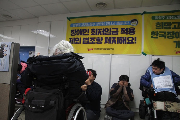 전국장애인차별철폐연대, 전국장애인부모연대는 21일 오후 3시, 서울 중구 남산스퀘어빌딩 11층 한국장애인고용공단을 점거하고 △중증장애인 공공일자리 1만 개 △최저임금법 ‘장애인 최저임금 적용 제외’ 조항 삭제 △한국장애인고용공단 개혁을 요구했다. 이들은 김영주 고용노동부 장관 면담과 중증장애인 노동권 3대 요구안 논의를 위한 협의기구 설립을 요구하며, 무기한 점거 농성을 할 계획이라고 밝혔다.