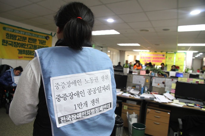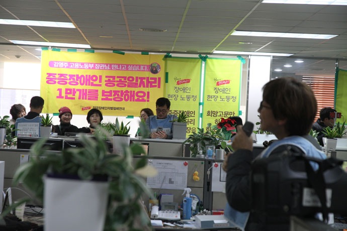 전국장애인차별철폐연대, 전국장애인부모연대는 21일 오후 3시, 서울 중구 남산스퀘어빌딩 11층 한국장애인고용공단을 점거하고 △중증장애인 공공일자리 1만 개 △최저임금법 ‘장애인 최저임금 적용 제외’ 조항 삭제 △한국장애인고용공단 개혁을 요구했다. 이들은 김영주 고용노동부 장관 면담과 중증장애인 노동권 3대 요구안 논의를 위한 협의기구 설립을 요구하며, 무기한 점거 농성을 할 계획이라고 밝혔다.