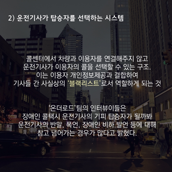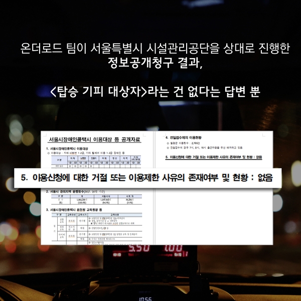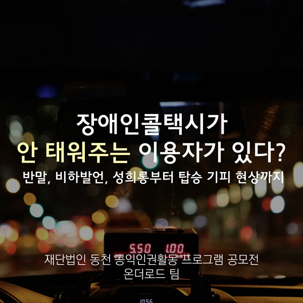 | [편집자 주] 재단법인 동천에서 주관하는 제7회 공익인권공모전에 참여하는 ‘온더로드’팀의 장애인콜택시 문제 해결을 위한 프로젝트 연재를 싣습니다. 온더로드는 서울시에 장애인콜택시 현황 정보공개청구, 장애인콜택시 이용자 100여명을 대상으로 한 온/오프라인 설문조사 등을 통해 장애인콜택시 문제를 조사했으며, 이를 앞으로 세 번의 카드뉴스와 세 번의 기획기사 및 정리기사로 비마이너 지면을 통해 알릴 예정입니다. 온더로드는 이를 바탕으로 청와대 국민청원, 인권위 진정 등의 활동을 이어나갈 계획입니다. |