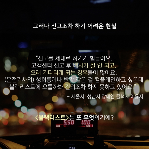 "신고를 제대로 하기가 힘들어요. 고객센터 신고 후 배차가 잘 안 되고, 오래 기다리게 되는 경우들이 많아요. (운전기사의) 성희롱이나 반말 같은 걸 컴플레인하고 싶은데 블랙리스트에 오를까봐 건의조차 하지 못하고 있어요." - 서울시, 성남시 장애인 콜택시 이용자