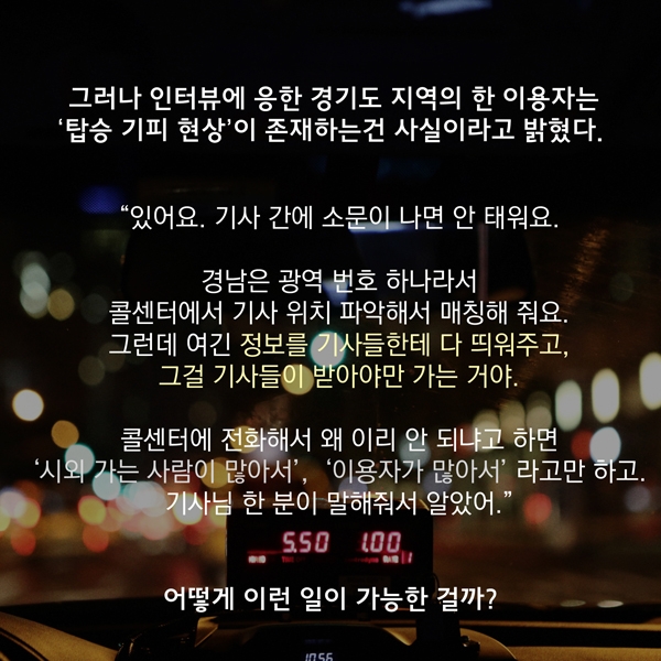 "있어요. 기사 간에 소문이 나면 안 태워요. 경남은 광역 번호 하나라서 콜센터에서 기사 위치 파악해서 매칭해 줘요. 그런데 여긴 정보를 기사들한테 다 띄워주고, 그걸 기사들이 받아야만 가는 거야. 콜센터에 전화해서 왜 이리 안 되냐고 하면 '시외 가는 사람이 많아서', '이용자가 많아서'라고만 하고. 기사님 한 분이 말해줘서 알았어."