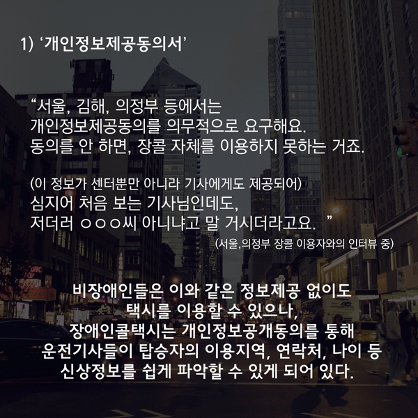 "서울, 김해, 의정부 등에서는 개인정보제공동의를 의무적으로 요구해요. 동의를 안 하면, 장콜 자체를 이용하지 못하는 거죠. (이 정보가 센터뿐만 아니라 기사에게도 제공되어) 심지어 처음 보는 기사님인데도, 저더러 ㅇㅇㅇ씨 아니냐고 말 거시더라고요." (서울, 의정부 장콜 이용자와의 인터뷰 중)
