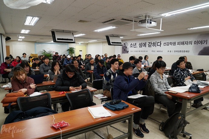 선감학원 피해생존자 이대준씨의 이야기다. 우리는 이 소년들의 죽음을 어떻게 듣고, 그 기록을 복원해야 할까? <비마이너>는 지난 1년 동안, '부랑인 강제수용의 역사’ 연재를 통해 한국 근대화를 관통하는 부랑인이라 낙인찍힌 자들에 대한 국가폭력을 분석하고, 이어 이의 구체적인 사례로 선감학원 피해자 8명의 구술 인터뷰를 연재했다. 이 여정을 마무리 짓고 부랑인 시설에서 발생한 국가폭력의 진상규명을 논의하기 위한 행사 '소년, 섬에 갇히다-선감학원 피해자의 이야기'가 지난 18일 대학로 노들장애인야학 4층에서 열렸다.