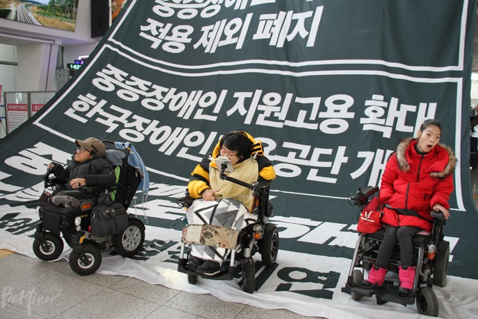 이들은 중증장애인 노동권 보장을 촉구하며 85일간 점거했던 한국장애인고용공단 서울지사 농성을 ‘중단’한 13일 오전, 85일간의 농성 짐을 그대로 싸들고 서울역에 왔다.