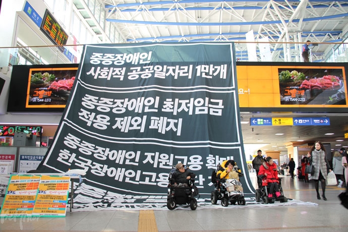 서울역에 중증장애인 노동권 보장을 촉구하는 대형 현수막이 걸렸다.