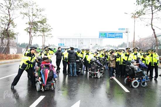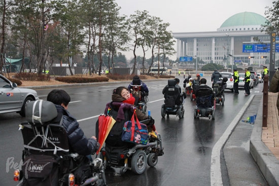 ![]() ▲기자회견을 마친 중증장애인들이 국회를 향해 가고 있다. |