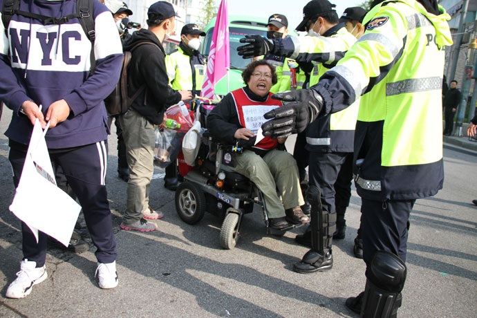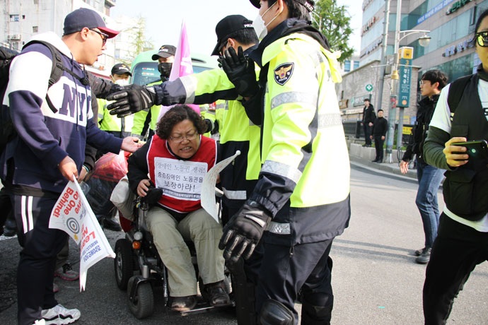 장애인차별철폐의 날인 20일 오전, 420장애인차별철폐공동투쟁단(아래 420공투단)이 청와대 앞 종로장애인복지관에서 경복궁역과 광화문을 지나 대학로 마로니에공원까지 행진하고 있다. 이들은 1시간가량 경복궁역과 광화문 거리를 막아서며 장애인이 처한 현실을 시민들에게 알렸다.