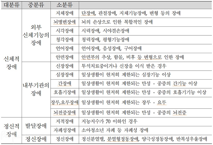 단적인 예로, 신체기능 장애 안에 안면장애가 포함되어 있다. ‘안면’을 신체기능으로 정의할 수 있을까? 굳이 들뢰즈를 거론하지 않아도 ‘안면’은 ‘머리’라는 신체기관이 아니라 그 표면에 형성된 사회적 ‘의미’ 기관이다. 안면의 기능은 신체적 기능이 아니라, 심미적, 기호적, 소통적 기능이다. 안면의 기능장애는 성형외과, 피부과가 아니라 문화 기호학의 판단영역이다. 그것의 장애 정도, 즉 일상생활과 사회활동에서 타인의 시선에 의한 활동의 제약 정도는 노출된 안면부의 몇 퍼센트가 변형되었는지, 그 중에서 코 형태의 몇 분의 몇이 없어졌는지의 기준으로 측정될 수 없다. 참고로, 중중도로 분류될 안면장애 3급의 기준은 “노출된 안면부의 50% 이상의 변형이 있고 코 형태의 2/3 이상이 없어진 사람”이다.