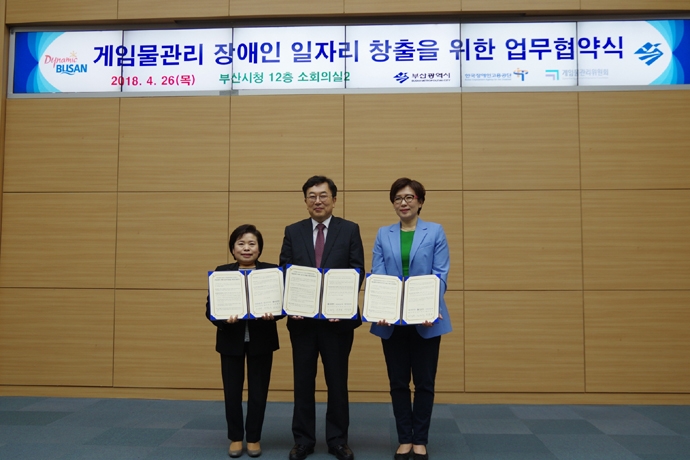 한국장애인고용공단은 26일 부산광역시, 게임물관리위원회와 '게임물관리 장애인 일자리 창출을 위한 업무 협약'을 체결했다.