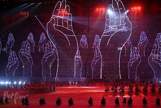 개막식 성화는 8만 관중이 지켜보는 가운데 패럴림픽 금메달리스트인 중국의 육상스타 장리신(27)과 장하이위안(33)이 계단으로 이루어진 40미터 높이의 점화대에 올라 열전의 시작을 알리는 불을 붙였다.