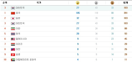 ![]() ▲ 2010광저우장애인아시안게임 종합순위 |