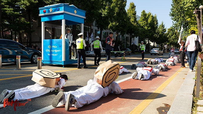 이들은 기자회견을 마친 뒤 달팽이 관을 메고 청와대까지 오체투지 행진을 했다. 도착해서는 “상품이 아닌 권리! 주거권 보장을 원한다”면서 △전·월세상한제 및 계약갱신청구권 도입 △장기공공임대주택 공급 확대 △부동산 보유세 강화 △주거 취약계층 주거 지원 확대 △강제퇴거 금지 △청년 주거권 보장 △대학생 공공기숙사 확충 등이 담긴 요구안을 청와대에 전달했다.