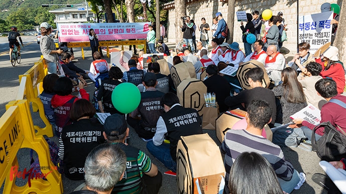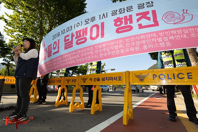3일 유엔이 정한 ‘세계 주거의 날(10월 첫째 주 월요일)’을 맞아 빈곤사회연대 등 24개 단체가 서울 광화문광장에서 주거권 보장을 요구하는 기자회견을 얼었다. 이후 광화문에서 청와대까지 오체투지를 하며 ‘집 없는 사람들의 달팽이 행진’을 펼쳤다. 청와대에 도착해서는 주거권 보장 요구안을 청와대에 전했다.