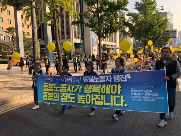 보육교사, 요양보호사, 장애인활동지원사, 사회복지 노동자들이 사회서비스의 공공성 강화를 요구하며 도심 행진에 나섰다. 이들 돌봄 노동자는 서울시청부터 광화문, 종각, 을지로에 이르는 2km 코스를 행진하며 최근 후퇴를 거듭하고 있는 ‘사회서비스원’의 제대로 된 설립을 요구했다.