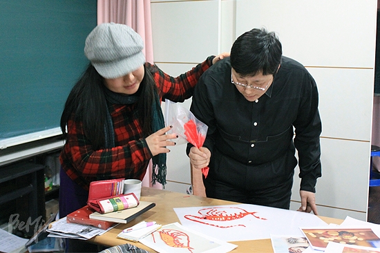 ![]() ▲'내멋대로 그려도 아름다워' 미술반 강사를 맡은 조사랑 씨가 조은경 씨의 작품에 대해 조언하고 있다. |