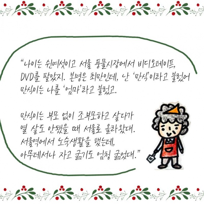 만식이는 부모 없이 조부모하고 살다가 열 살도 안 됐을 때 서울로 올라왔대. 서울역에서 노숙생활을 했는데, 아무 데서나 자고 굶기도 엄청 굶었대.”