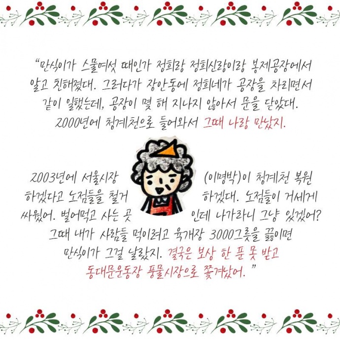 2003년에 서울시장(이명박)이 청계천 복원하겠다고 노점들을 철거하겠대. 노점들이 거세게 싸웠어. 벌어 먹고사는 곳인데 나가라니 그냥 있겠어? 그때 내가 사람들 먹이려고 육개장 3000그릇을 끓이면 만식이가 그걸 날랐지. 결국은 보상 한 푼 못 받고 동대문운동장 풍물시장으로 쫓겨났어.”