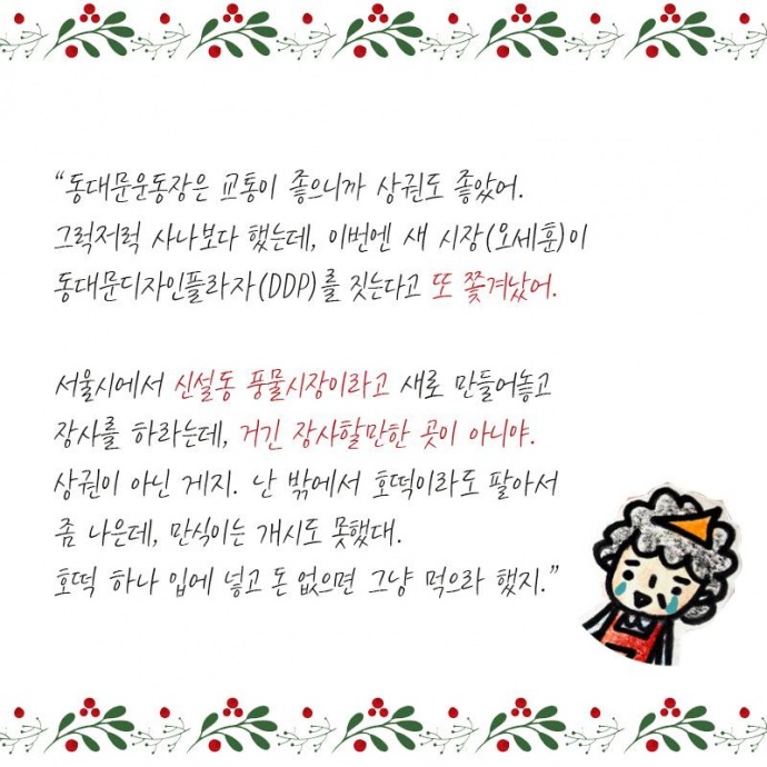 7. “동대문운동장은 교통이 좋으니까 상권도 좋았어. 그럭저럭 사나보다 했는데, 이번엔 새 시장(오세훈)이 동대문디자인플라자(DDP)를 짓는다고 또 쫓겨났어.