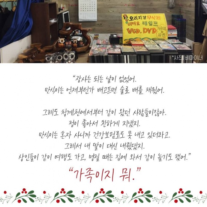 5. “나이는 쉰여섯이고 서울 풍물시장에서 비디오테이프, DVD를 팔았지. 본명은 최만인데, 난 ‘만식’이라고 불렀어. 만식이는 나를 ‘엄마’라고 불렀고.