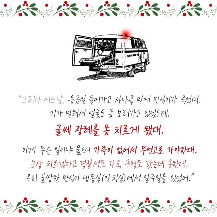 9. “응급실 들어가고 사나흘 만에 만식이가 죽었대. 기가 막혀서 얼굴도 못 보러 가고 있었는데, 글쎄 장례를 못 치르게 됐대. 이게 무슨 일이냐 물으니 가족이 없어서 무연고로 가야 한대. 초상 치르겠다고 경찰서도 가고, 구청도 갔는데 못한대. 우리 불쌍한 만식이 냉동실(안치실)에서 일주일을 있었어.”