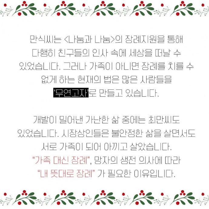10. 만식씨는 <나눔과 나눔>의 장례지원을 통해 다행히 친구들의 인사 속에 세상을 떠날 수 있었습니다. 그러나 가족이 아니면 장례를 치를 수 없게 하는 현재의 법은 많은 사람들을 ‘무연고자’로 만들고 있습니다.