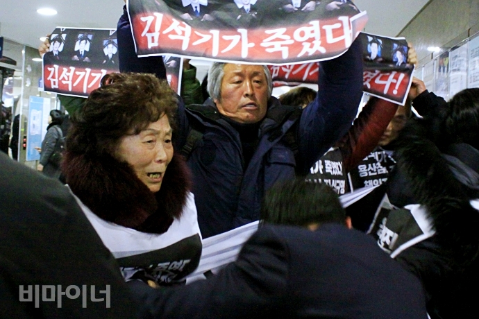 용산 참사 10주기를 5일 앞둔 15일 오후 5시경, 용산 참사 유가족 및 생존자들이 국회를 찾았다. 이들은 국회의원회관 제8간담회실에서 ‘용산참사 10주기 강제퇴거 피해자 증언대회’를 마친 뒤, 2층 로비에서 김 의원 사퇴촉구 결의를 국회의원들에게 요구하는 긴급 기자회견을 진행하려 했다. 이들은 '김석기가 죽였다!', '용산 참사 책임자 김석기는 사퇴하라' 등의 문구가 적힌 손팻말을 들어 올리며 "용산 참사 책임자 김석기를 처벌하라" 등의 구호를 외쳤다.
