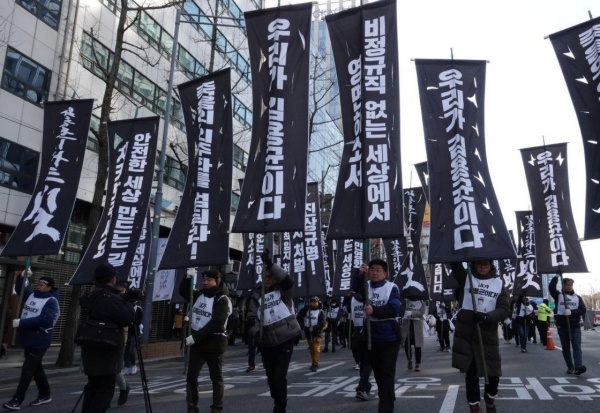 1,100만 비정규직 공동투쟁에 나선 김수억 기아차비정규직지회 지회장은 “죽음과 위험을 비정규직 노동자에게 떠넘기지 않고, 불법파견 사용자가 법대로 처벌받는 사회, 노조하기 쉽고, 비정규직을 맘대로 쓰다 버리지 않는 나라, 일하다 죽지 않고, 일한 만큼 대접받고, 행복을 꿈꿀 수 있는 세상. 노동자가 주인 되는 세상을 위해 매일매일 김용균을 가슴에 안고 싸우겠다”라고 밝혔다.