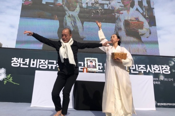 이날 영결식에서 송경동 시인은 ‘진상을 규명해야지요’ 시를 낭독했고, 서정숙 씨와 이삼헌 씨는 진혼무를 췄다. 장문희 명창은 김용균 노동자가 듣고 자랐다는 ‘잘자라 우리 아가’를 비롯해 조가를 선보였다.