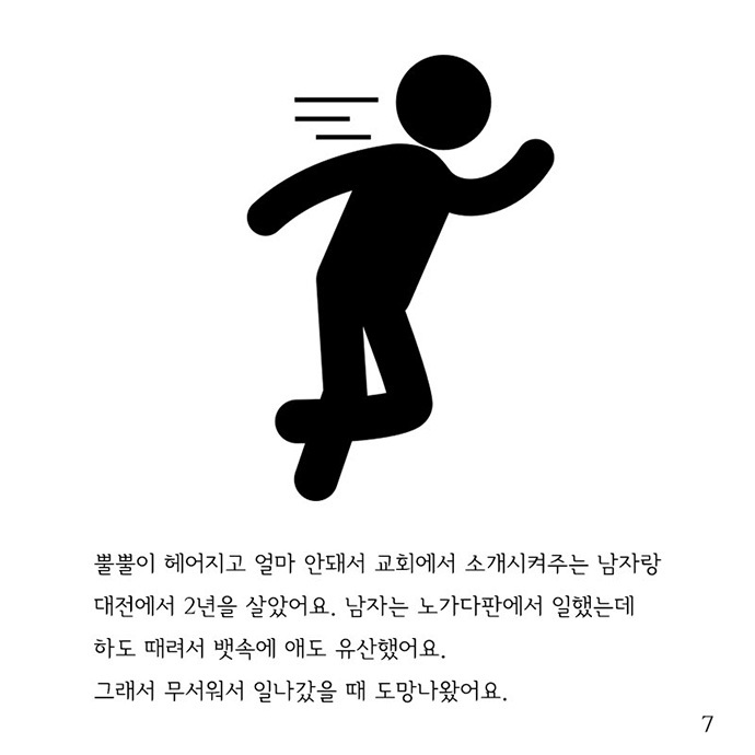 사진 7] 뿔뿔이 헤어지고 얼마 안 돼서 교회에서 소개시켜주는 남자랑 대전에서 2년을 살았어요. 남자는 노가다판에서 일했는데 하도 때려서 배 속에 애도 유산했어요. 그래서 무서워서 일 나갔을 때 도망 나왔어요.