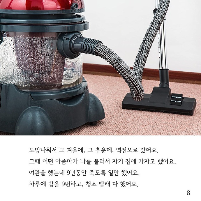 사진 8] 도망 나와서 그 겨울에, 그 추운데, 역전으로 갔어요. 그때 어떤 아줌마가 나를 불러서 자기 집에 가자고 했어요. 여관을 했는데 9년 동안 죽도록 일만 했어요. 하루에 밥을 9번하고, 청소 빨래 다 했어요.