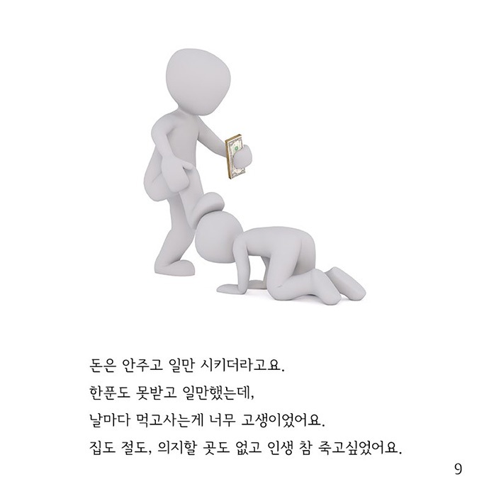 사진 9] 돈은 안 주고 일만 시키더라고요. 한 푼도 못 받고 일만 했는데, 날마다 먹고사는 게 너무 고생이었어요. 집도 절도, 의지할 곳도 없고 인생 참 죽고 싶었어요.