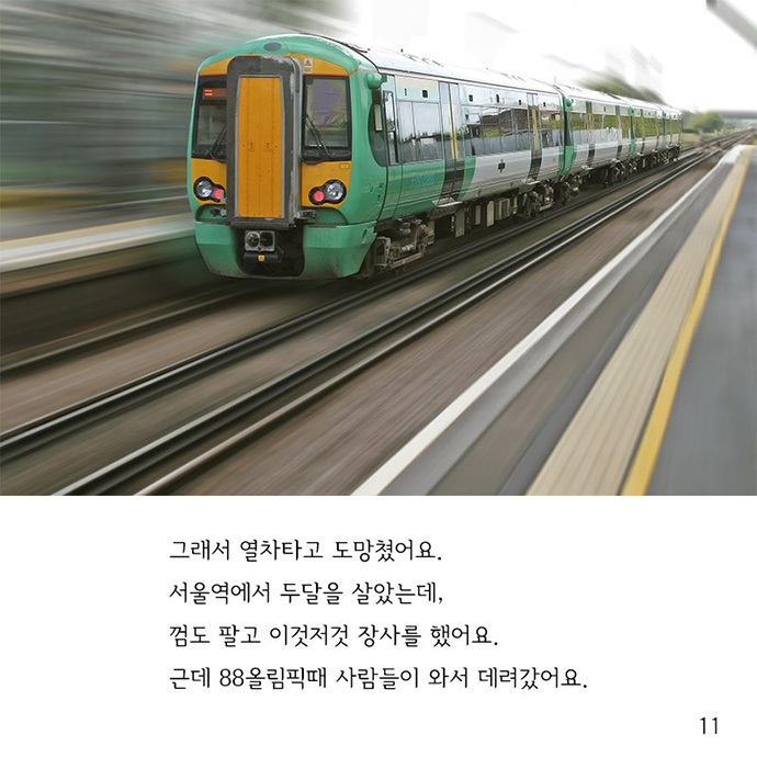 사진 11] 그래서 열차 타고 도망쳤어요. 서울역에서 두 달을 살았는데, 껌도 팔고 이것저것 장사를 했어요. 근데 88올림픽 때 사람들이 와서 데려갔어요.